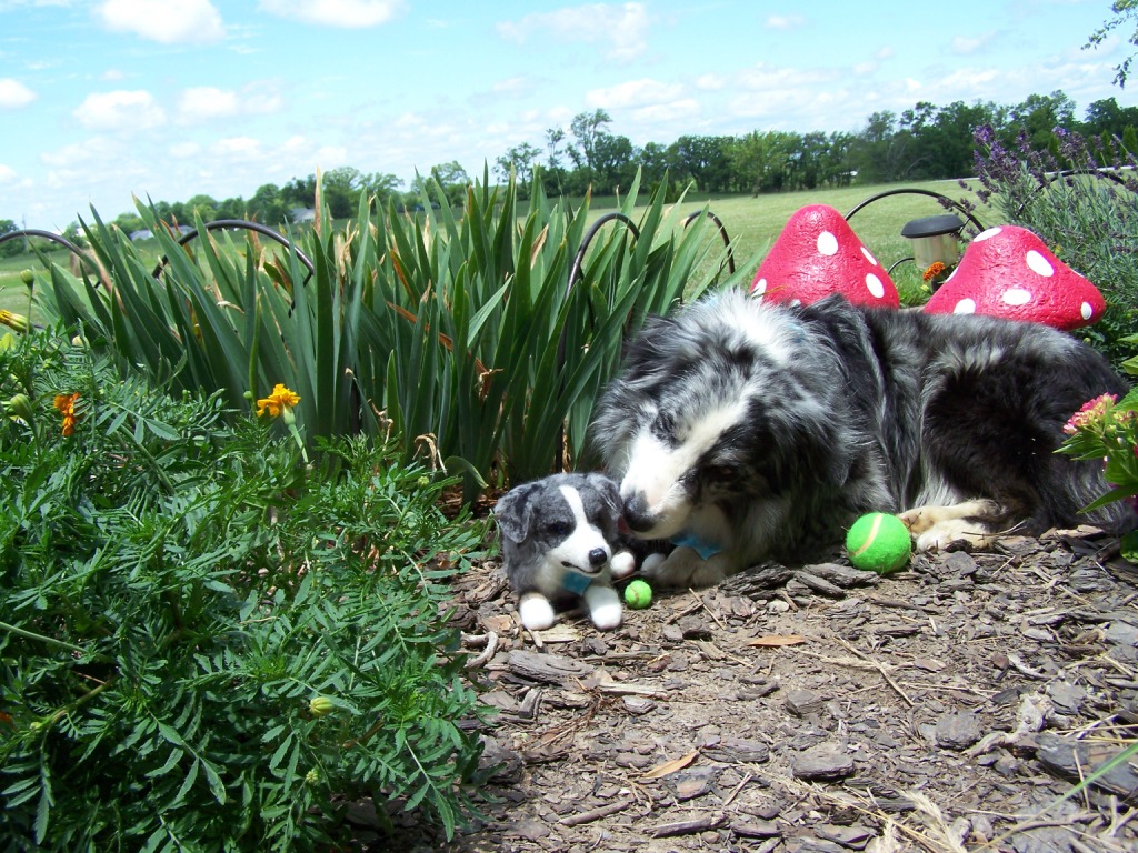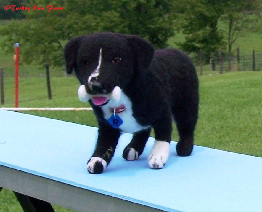 DOB: 2/12/2015, 10" tall (25.5 cm) and 9" long (23 cm), glass eyes, Merino wool and Fiber fill. Australian shepherd "Zuzka" is one of our beloved companions here at Turkey Run.