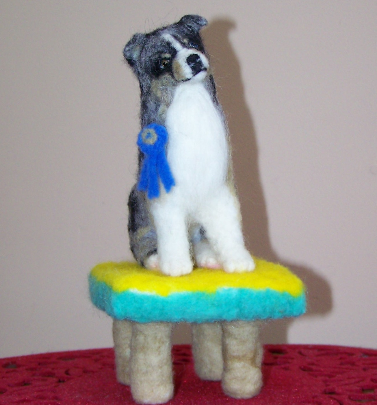 Gracie is my 1-year-old Australian shepherd that I am so happy to own. Gracie is that type of a dog that loves everybody and everybody loves her. Felted Gracie was entered in our County Fair in "Miscellaneous class" were she was awarded Red ribbon, right after Max who stole the blue one and the 1st place.