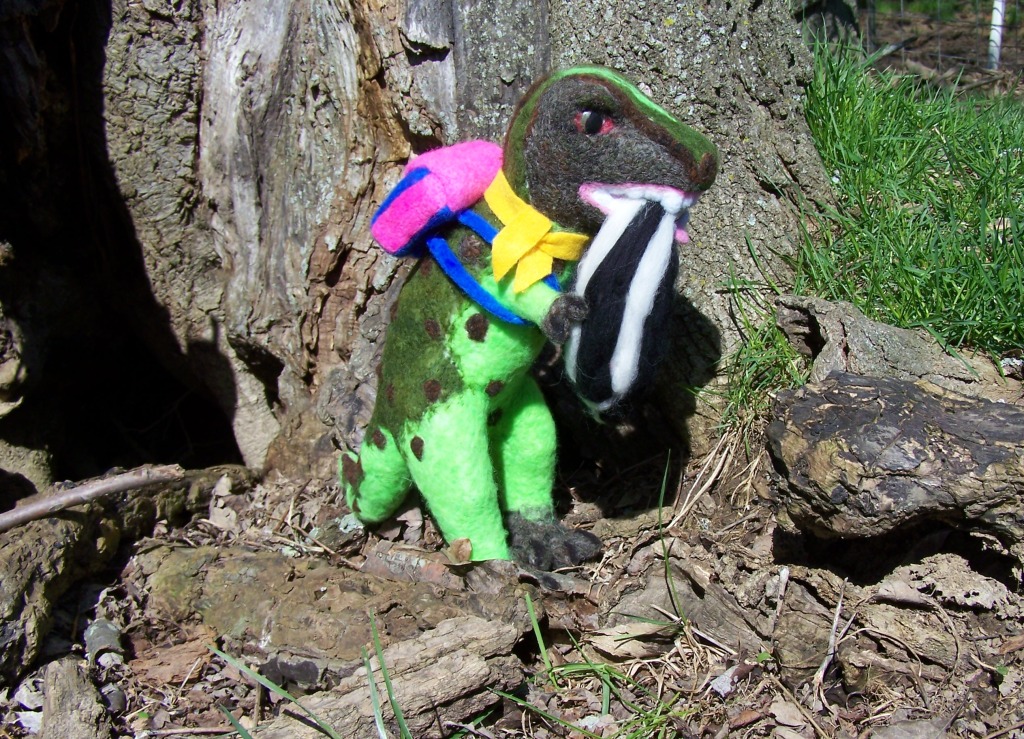 DOB: 10/5/2014, 12" tall (30.5 cm) and 12" long (30.5 cm), hand-made eyes from polymer clay, mostly Merino wool and some Premium Polyester Fiber Fill (inside only), no wire at all. This needle felted T-Rex was crafted for my youngest customers...my wonderful kids who suggested the whimsical touch like the skunk and the backpack.